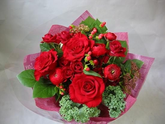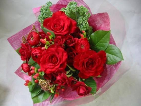 バラ、スプレーバラ、ヒペリカム、赤系季節のお花、グリーン
