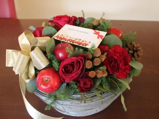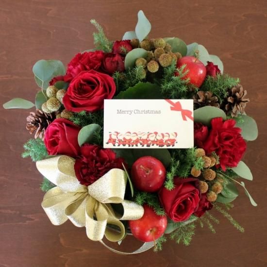 真っ赤なバラや実物、ゴールドのリボン、グリーン等で華やかにお部屋を彩りますよ♪