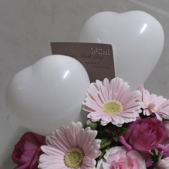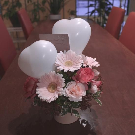 ピンク系の可愛らしいアレンジにハートのバルーンをプラス♪ ラブリーなアレンジに仕上げました。