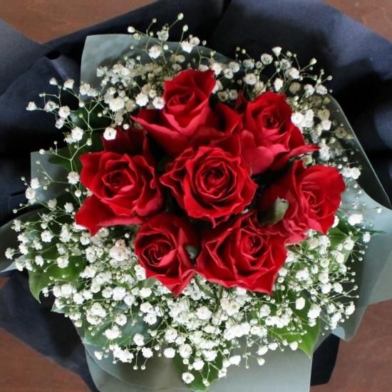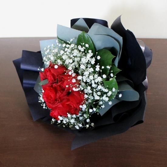 赤バラとカスミ草を合わせてシンプルなラウンドブーケに仕上げました。