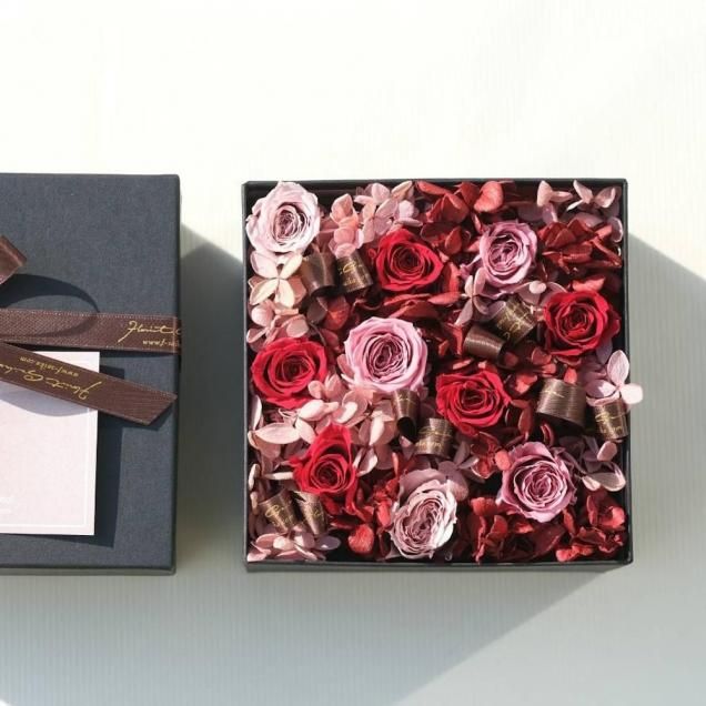 レッド・ピンク系の可愛らしいお花を集めたBOXタイプのプリザーブドアレンジ。